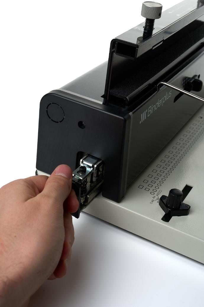 Cambiando la matriz, se puede seleccionar entre perforación rectangular 2:1 (para anillos doble alambre) y perforación circular 4:1 (para espirales plásticos).
